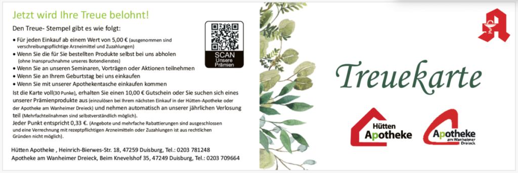 - Für jeden Einkauf ab einem Warenwert von 5,-€ (ausgenommen sind verschreibungspflichtige Arzneimittel und Zuzahlungen)